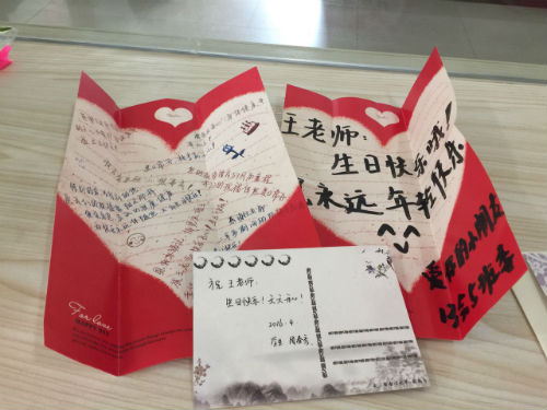 老师们陆续到齐,寿星们戴上事先准备的生日帽,生日会便拉开了帷幕。蛋糕上嵌着“1”、“8”字样的蜡烛,寄寓着寿星们永远十八岁的美好愿望,活泼而有趣。点亮蜡烛后,全体老师唱起了生日快乐歌,在一声声“祝你生日快乐”中,寿星们纷纷收到了各自学生们精心制作的生日贺卡,饱含诚挚祝福和感谢的贺卡和祝辞让在场的寿星们笑逐颜开。随后,老师们一边畅谈一边吃蛋糕,温馨和感动弥漫在整个学院楼。