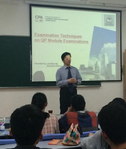 2015年10月15日下午,香港会计师公会执行总监伍大成先生为我院第一次报考香港注册会计师考试(QP)的同学做考前指导。伍大成先生从学习时间安 排,工作坊的重要性,考试答题技巧和书写等方面为同学们做了详细的讲解。同学们获益良多,纷纷表示经过此次考前指导,对于QP考试有了更直观的了解,可以 有效合理地安排考前复习,希望可以考出好的成绩。 (葛晓蕊)