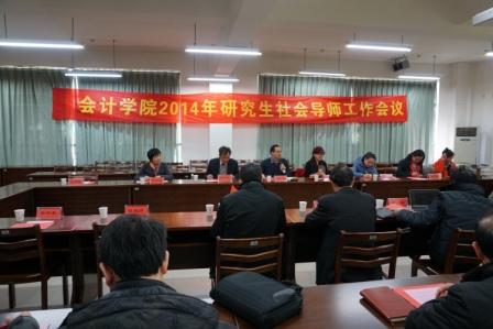 2014年12月16日,会计学院召开了2014年研究生社会导师工作会议。会议由会计学院邓川副院长主持。广宇集团股份有限公司副总裁邵少敏、浙江天平会计师事务所董事余俊仙、浙江省卫生厅总会计师骆水娣、浙江永通纺织品进出口有限公司董事长裘菊兰,以及来自天健会计师事务所等多家知名单位任职的社会导师,校内导师参加了会议。