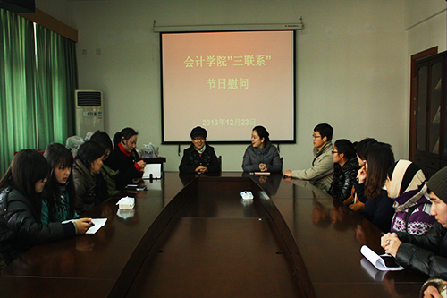 12月23日中午,会计学院在学院楼406会议室举行了“三联系”节日慰问活动, 为我院“三联系”学生和来自新疆等部分外省同学送上一份冬日温暖。张红英书记、于永生副院长、张虹副书记以及全体辅导员参加此次活动,会议由张虹老师主持。