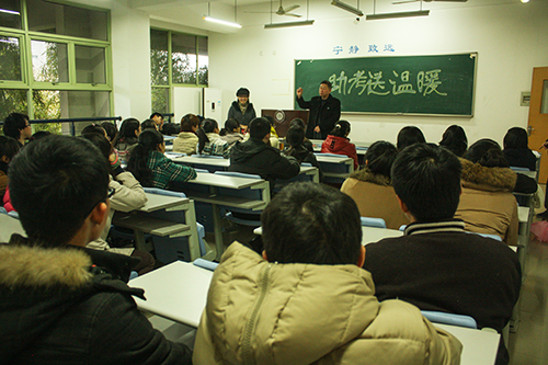 本科毕业何去何从?这里有一群人努力着奋斗着,有时奋笔疾书,有时伏案沉思,他们进入了考研的倒计时。在这紧张的 备考时期,会计学院老师为他们送上了一份温暖。12月17日下午在会计学院101举行了助考研送温暖活动,汪祥耀院长、张红英书记、张虹副书记、王敏老师 等一起为考研的学子助威加油。