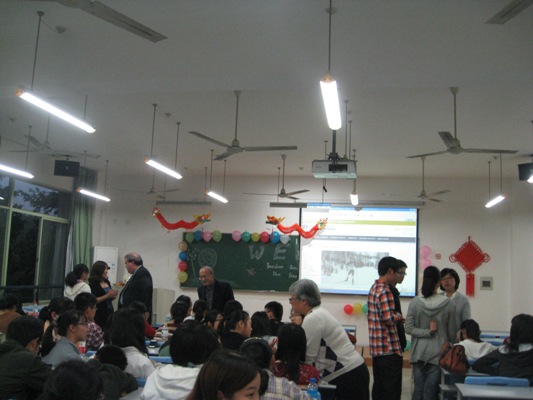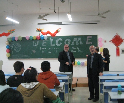 日前,加拿大劳伦森大学(Laurentian University)校长一行五人代表团抵下沙访问我校。校长Dominic Giroux此行的目的之一是与我校在中方签署两校办学协议。鉴于双方对该项目的高度重视,根据事先约定,两校合作办学协议需在中方和加方两国办学地点分别签署方可生效。据悉,我校副院长黄建新一个月前已专程赴加拿大劳伦森大学举行了签约仪式,并受到加方的热情欢迎和接待。这次,同样的场景在中方再次进行!10月23日上午,两校校长、院长中方签字仪式在浙江财经学院主校区行政楼406室举行。劳伦森大学管理学院院长Peter Luke、加拿大注册会计师协会(CGA-Canada)中国执行董事Barbara Ko 女士,金帆专业科技培训中心总裁梁金池先生等;会计学院院长汪祥耀、副院长邱学文、中加合作项目主任傅黎瑛、国际交流合作处处长余慕鸿等出席了本次签约仪式。Dominic Giroux校长签字后颇有感触地说:两校教育合作领域宽广,双方的友好合作关系必将有长足的深入和发展。 图1:出席两校签约仪式的中加双方主要人员合影 签约仪式结束后,我院汪祥耀院长陪同Dominic Giroux 校长漫步校园及钱塘江畔,一边欣赏秋日风景,生动解说校园各主要景点(王芳题词、学涯湖、图书馆、油筒、体育馆、会计学院的“算盘”等等)及钱塘江、钱江潮等,一边就中加合作项目的进一步开展以及两校在科研、博士生联合培养、加拿大学生赴“浙财”留学等事宜进行了深度的交谈。Dominic Giroux校长表示,加拿大的学生对赴“浙财”留学非常感兴趣,开办“加中班”将是两校合作项目的又一个重要举措。同时,他对两校在科研、博士生联合培养等领域拓展进一步合作空间充满信心。中加项目负责人傅黎瑛教授、我院办公室主任郑永在场陪同。 图2:Dominic Giroux校长与汪祥耀院长漫步校园,畅谈合作事宜 图3:Dominic Giroux校长与汪祥耀院长、傅黎瑛教授在学涯湖边合影 Dominic Giroux校长此行的目的之二是与我校9月份刚入学的首批“中加班”学生见面。10月22日下午,校长Dominic Giroux、管理学院院长Peter Luk、CGA-Canada(加拿大注册会计师协会)执行理事Barbaro Ko女士等一行五人在会计学院相关老师的陪同下,来到了由“中加班”学生精心布置的体现“中国风”的教室,与学生们进行了亲切的会面和交流。Dominic Giroux重点介绍了劳伦森大学的校园及其生活和学习情况、加拿大的跨文化优势和人文特色以及学生们赴加前应做哪些学习准备以便今后出国时能够尽快适应环境。接着,同学们纷纷踊跃举手提问,问题涉及生活、学习、社团活动、人权等各方面。校长和院长对于所提出的问题非常耐心地一一解答。现场提问之后,代表团一行还与学生们进行了一对一的自由交谈,并为之签名、与之合影留念。整个见面会历时近两个小时。我校“中加班”学生活泼可爱、素质优良、英语沟通能力强等风貌给校长一行留下了极其深刻的印象!而对于这些“中加班”学生而言,他们认为自己太幸运了!作为刚入学的新生,两个月之内先后与国外合作院校的校长与院长近距离接触,这在他们入学前连想都不敢想的事情!许多同学纷纷表示,他们一定更加倍努力学习,使自己在该中外合作学习项目中发挥更大的优势。(注:劳伦森大学管理学院院长Peter Luk在9月初的时候已先行专程来学校看望了正在军训的该校“中加班”学生,对学生赴加一年学习期间的学分要求及课程安排、赴加前的英语学习(EAP)和水平要求等问题作了具体的阐释,使他们对该项目的具体情况有了及时而详细的了解。)