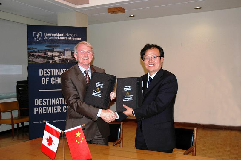 9月24日下午,中加合作办学项目签约仪式在加拿大劳伦森大学萨德伯里(Sudbury)主校区隆重举行。我校副院长黄建新、会计学院副院长李连华、党总支副书记张红英、中加合作项目主任傅黎瑛教授等与劳伦森大学副校长Robert Kerr、教务长Ronald Smith、留学生部主任Melissa Keeping、管理学院院长Peter Luk、公关部主任Joanne Musico、资产项目主任Belaid Aouni教授、CGA执行理事Babara Ko女士和金帆专业科技培训中心总裁梁金池先生等出席签约活动。Robert Kerr副校长和黄建新副院长分别致辞。Robert Kerr副校长表示劳伦森大学已为中加合作项目(会计学双学位)在师资配备、后勤保障等方面做好了充分准备。他认为该项目的培养模式极具竞争力和发展前景,相信经过双方的共同努力,必将取得丰硕的成果。他还表示两校应进一步加强交流,合作是长远的、多方面的。黄建新副院长对加方为该项目所给予的支持和此行的热情款待表示诚挚的谢意,并对两校合作的前景和未来致以良好的祝愿!之后,代表团参观了劳伦森大学校园,并重点考察了该项目赴加留学学生的教学条件、后勤设施等。劳伦森大学先进的办学条件和优美的自然人文环境,给代表团留下了深刻的印象。当天晚上,劳伦森大学为我校代表团举行了盛大的欢迎宴会。