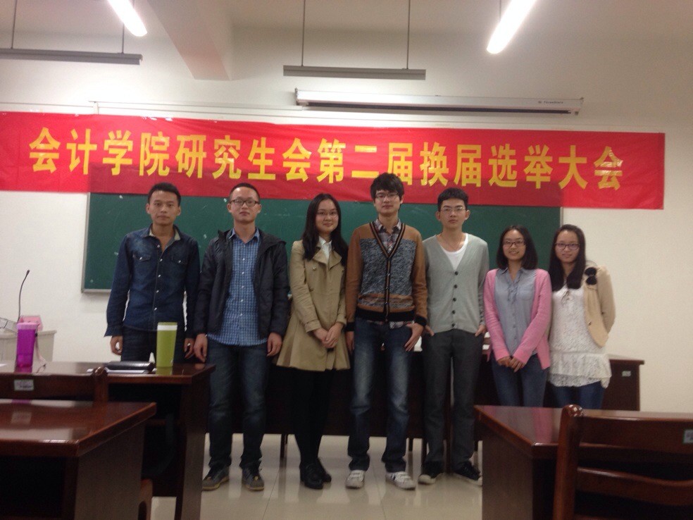 2013年10月30日,一个阴雨绵绵的下午,会计学院第二届研究生会换届选举大会在会计学院303教室拉开帷幕。会计学院党总支书记张红英、会计学院副院长邓川和会计学院研究生辅导员郭媚三位老师出席本次选举大会。