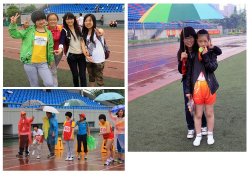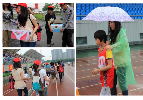 整个下午都飘着大雨,比赛仍冒雨进行。尽管天空不作美,但志愿者们的热情丝毫不减,风里来,雨里去。一名志愿者负责陪同一名运动员,不论运动员去哪,都必须全程陪同。在这样“一对一”的相处下,志愿者们和运动员们的距离更近了。同撑一把伞,一起面对比赛,共同分享成功的喜悦,有的志愿者还和运动员一起登上领奖台。