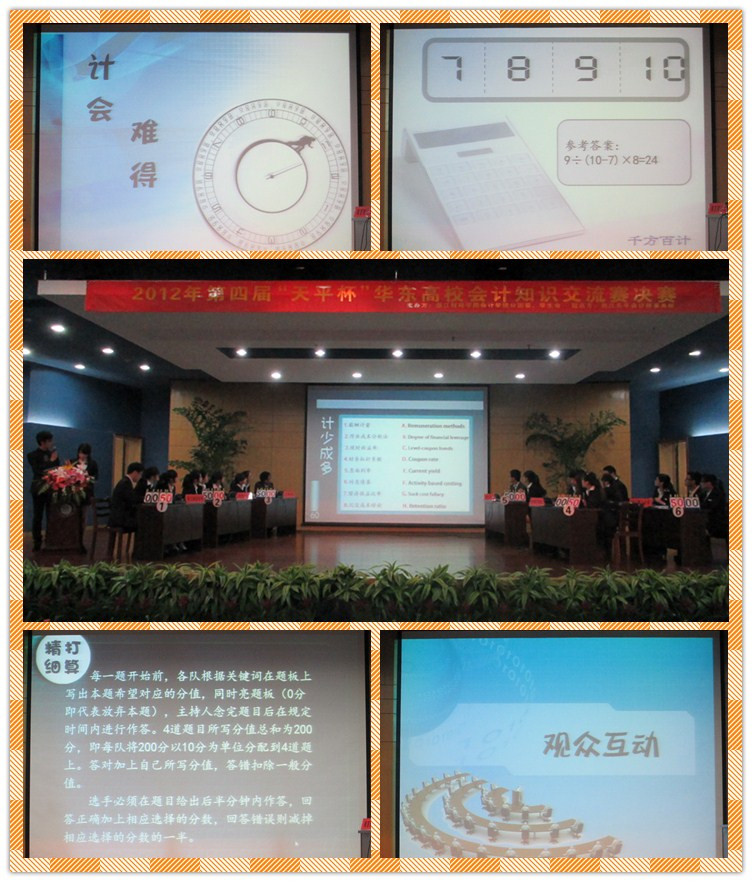 本届大赛为7所高校的精英设置了七道关卡。“先睹为会”环节中,七个代表队纷纷上场介绍自己的队伍,他们或风趣幽默,或文艺优雅,一看便知均是有备而来。“计少成多”环节中的中英会计名词连线题让不少选手们犯了难,但他们马上调整心态,在随后的抢答中力争回答权,5号的南京财经大学代表队更是以其出色的表现给全场观众和评委都留下了深刻的印象。而“千方百计”这一关则充分见证了浙财学生的计算能力和反应能力。1号浙江财经学院代表队的三名同学连续抢得回答权并且算出了正确答案。“计会难得”“精打细算”等环节也是精彩纷呈。最后,积分靠前的三支队伍进入了终极PK——“融会贯通”环节,他们在本环节对著名房地产企业万科的年报进行的细致的分析,并对改善其经济状况提出独到的见解,还一一条理清晰得解答来自其他四所高校的同学的犀利提问。七轮紧张激烈的角逐之后,根据前六个环节的积分以及评委老师的讨论,杭州电子科技大学代表队荣获一等奖,浙江工业大学、浙江理工大学代表队获得二等奖,浙江财经学院、上海立信会计学院、浙江工商大学、南京财经学院获得三等奖。而本届大赛的会问奖则颁给了来自上海立信会计学院的三位同学。