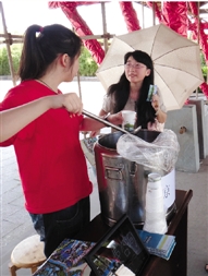 从早上8点开始,志愿者就泡好凉茶,招待来往游客,一天下来三四桶凉茶见空。
