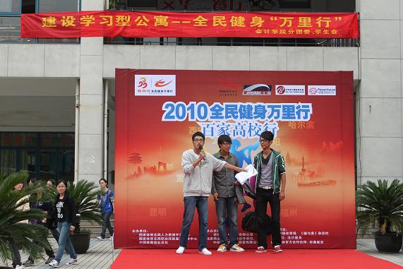 “全民健身万里行”活动是由国家体育总局主办的发展我国全民健身事业的重大品牌活动之一。本次活动的圆满成功,不仅将合理健康的生活方式传递给同学们,更重要的是通过本次活动,切实体现了会计学院建设“三自型学习型公寓”---“自我教育、自我管理、自我学习”的真正内涵。本次活动进一步提升了同学们对学习型公寓建设的认识,寓教于乐,进一步将学习型公寓建设从理论层面深入到园区、寝室和同学们亲身实践中,让同学们在生活中贴切的认识到什么是学习型公寓,如何积极响应学习型公寓的建设。 “寝入心扉驻学涯,桃李不言自成蹊”。学习型公寓“动”起来,一起来为健身喝彩!