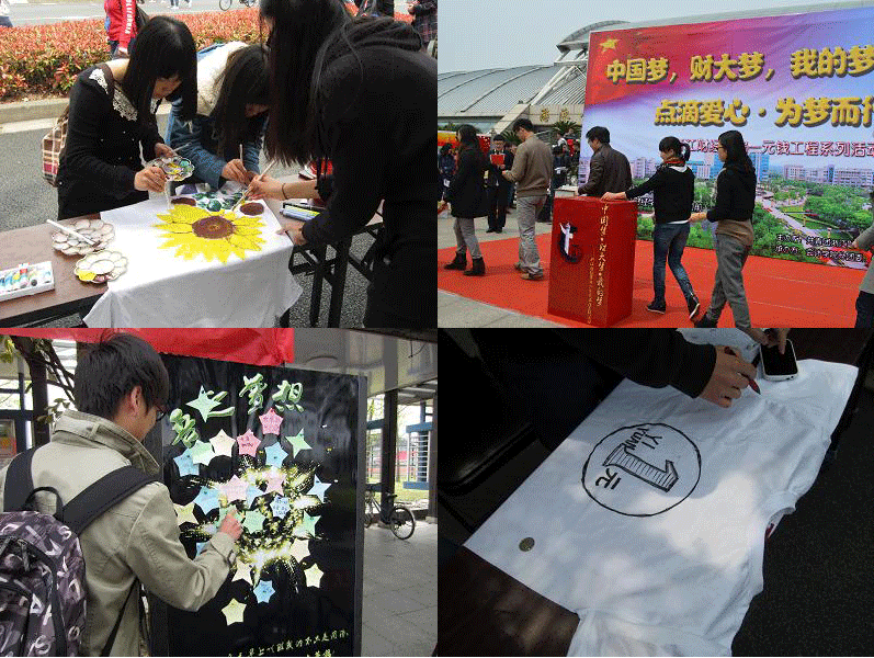 本次“中国梦,财大梦,我的梦:点滴爱心,为梦而行”浙江财经学院一元钱工程系列活动,以梦想导航,爱心支撑,立足校园,走向社会。活动伊始,寿冬尓同学 为全校师生报告诚信亭一年来的运营状况,与此同时,文化长廊上各二级学院正陆续完成各自手绘文化衫,以实际行动支持一元钱工程,为梦添彩、为爱护航。此 后,来自各学院的11位梦想大使上台一一发表励志宣言,从励志感悟寻访圆梦征程。不管是用绵薄之力远赴山区支教的爱心基金会成员,还是在诚信亭前投下一个 硬币的你我他,或是一步一脚印践行青春的梦想大使,都已成为正能量榜样的有力号召,众人一致宣誓,热情洋溢。