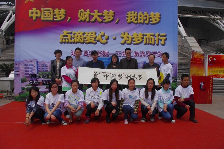 700多个声音喊出响亮的口号,汇聚成四月的浙财一道明亮的风景。由共青团浙江财经学院委员会主办、我院分团委承办的“中国梦,财大梦,我的梦,点滴爱心,为梦前行”一元钱工程系列活动于4月9日在校体育馆前隆重举行。