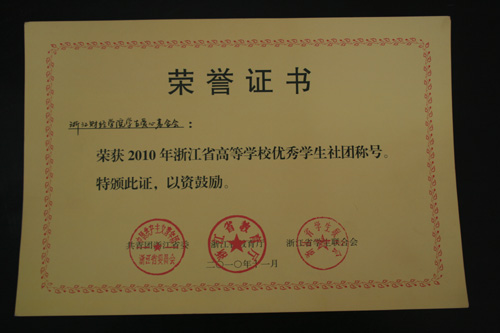 日前,共青团浙江省委、浙江省教育厅、浙江省学生联合会下发文件《关于表彰2010年浙江省高等学校优秀学生社团、优秀学生社团指导教师和优秀学生社团干部的决定》,我院学生爱心基金会荣获“2010年浙江省高等学校优秀学生社团”称号。