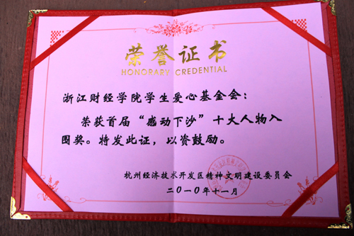 11月18日下午,由下沙开发区管委会和杭州电视台共同主办的2010“感动下沙”十大人物揭晓暨颁奖典礼在下沙城建文化馆隆重举行。我院学生爱心基金会榜上有名,成功入围。