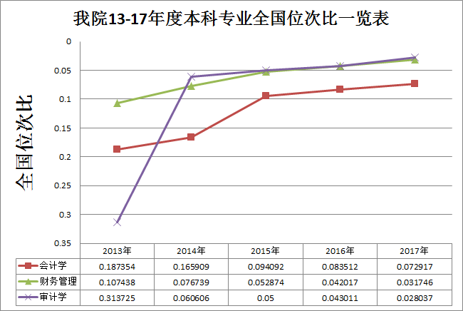 根据《武大邱均平版2017年ued体育 本科专业评价情况》,我院2017年审计学本科专业全国位次比为0.028037,财务管理本科专业为0.031746,会计学本科专业为0.072917,资产评估本科专业为0.136364,其中审计学专业连续三年跻身全国专业前5%并荣获5☆等级,财务管理专业连续两年跻身全国专业前5%并荣获5☆等级,会计学、资产评估专业连续荣获4☆等级,会计学、财务管理、审计学专业自13年开始专业排名逐年提高。