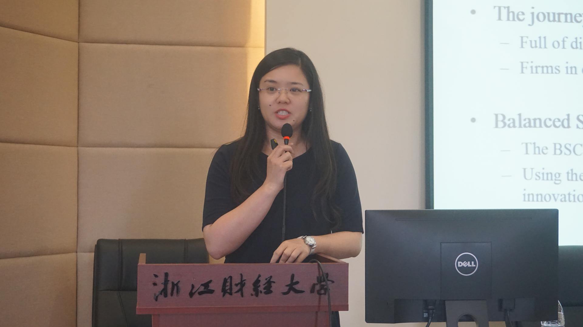 然后,我院张金丹博士给我们带来了题为“Empirical Evidence on the Use of Balanced Scorecard and innovation: Exploring the Role of Firm Competences and the Performance Consequences”的学术报告。张金丹博士先介绍了研究动机,她认为平衡积分卡作为战略管理控制系统,可以为企业在创新的过程中提供正确的关注和支持。基于此,张金丹博士介绍了论文的被解释变量、主要解释变量以及控制变量,并提出了数据模型,通过数据说明了平衡积分卡的使用与企业创新正相关,提供了使用BSC的企业追求创新的绩效后果的证据。