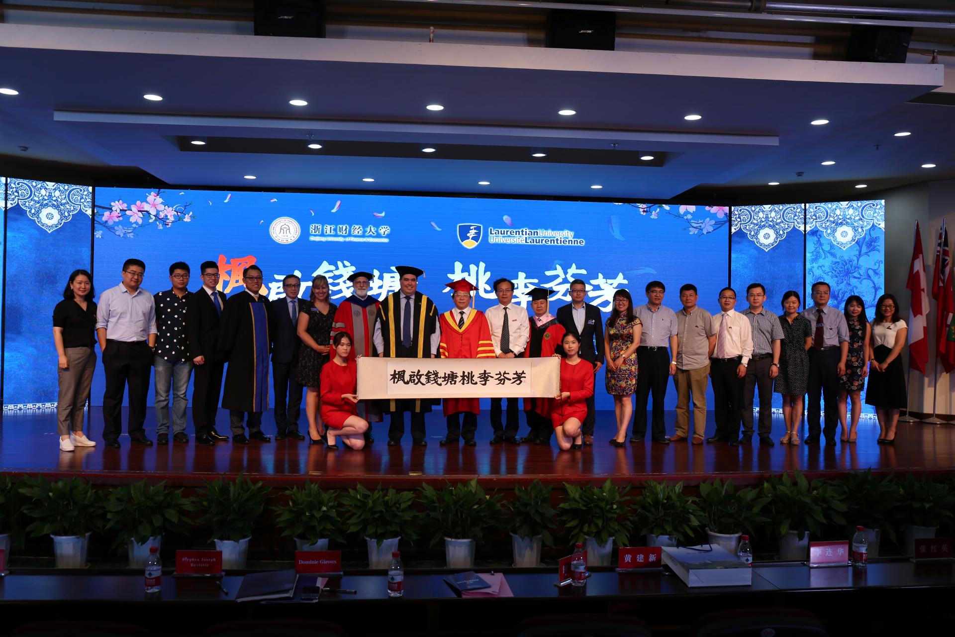6月10日下午,我校中加合作会计学项目2017届本科生毕业典礼在下沙校区隆重举行。钟晓敏、黄建新等领导与加拿大劳伦森大学校长Dominic Giroux先生、劳伦森大学商学院院长Stephen Havlovic先生、CPA Canada中国区执行理事Barbara Ko女士、加拿大驻沪总领馆领事,安大略政府驻上海代表处代表黄文楚先生、校友办主任Rachel Meehan 女士、商学院国际项目主任Hugo Chen 先生、劳伦森大学上海校友会会长罗维先生以及加拿大政府驻杭州贸易办事处商务专员助理王慧女士,会计学院师生代表及毕业生家长近500人参加了毕业典礼。