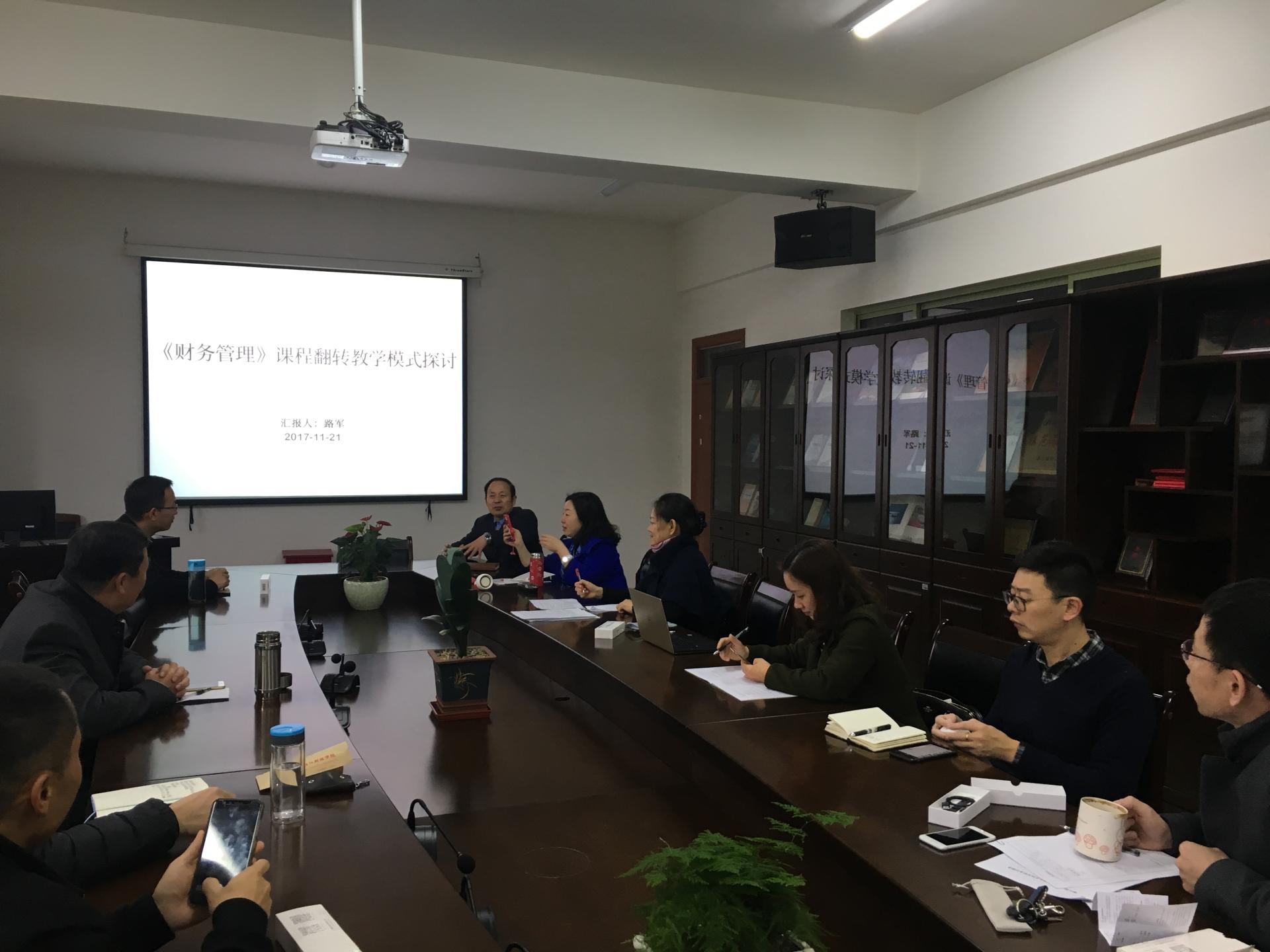 2017年11月21日下午15:00,财务管理系在会计学院406会议室召开教师教学发展活动,会议由系主任吕岩老师主持,主题为《财务管理》课程翻转教学模式探讨,由路军老师主讲。