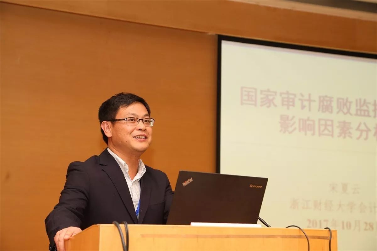 在主题报告阶段,中国人民大学宋常教授、南京审计大学校长刘旺洪教授、西南财经大学蔡春教授等11位专家学者分享了自己的研究成果。我院宋夏云老师作了“国家审计腐败监控效果影响因素分析”的主题报告。