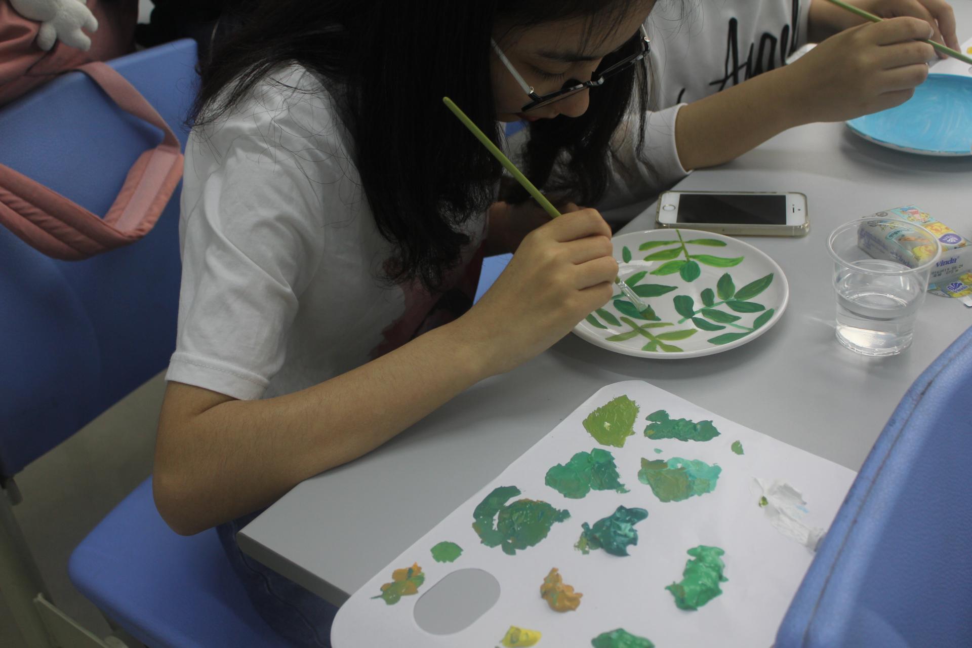 “我们人是知道要保护环境,治理水污染,而猫不知道,”一位对自己画作颇有信心的同学说,“她只知道清水中的鱼比较好吃,所以它渴望一条清澈的河流。”另外,还有一些同学在盘子上绘制荷花、沙滩等意象,以水来唤起人们对水的关注。