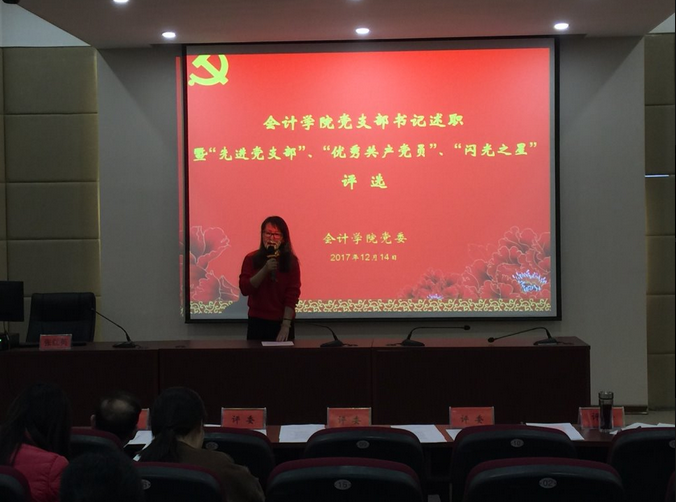 2017年12月14日下午,会计学院党委在学院楼211报告厅召开了2017年度党支部书记述职评议会暨“先进党支部”、“优秀共产党员”、“闪光之星”评选会。学院党委书记张红英、院长李连华、党委副书记张虹、党委委员王韵、余景选出席活动,并担任评委。各党支部书记和党员代表参加此次党日活动,本次活动由学院党委副书记张虹主持。