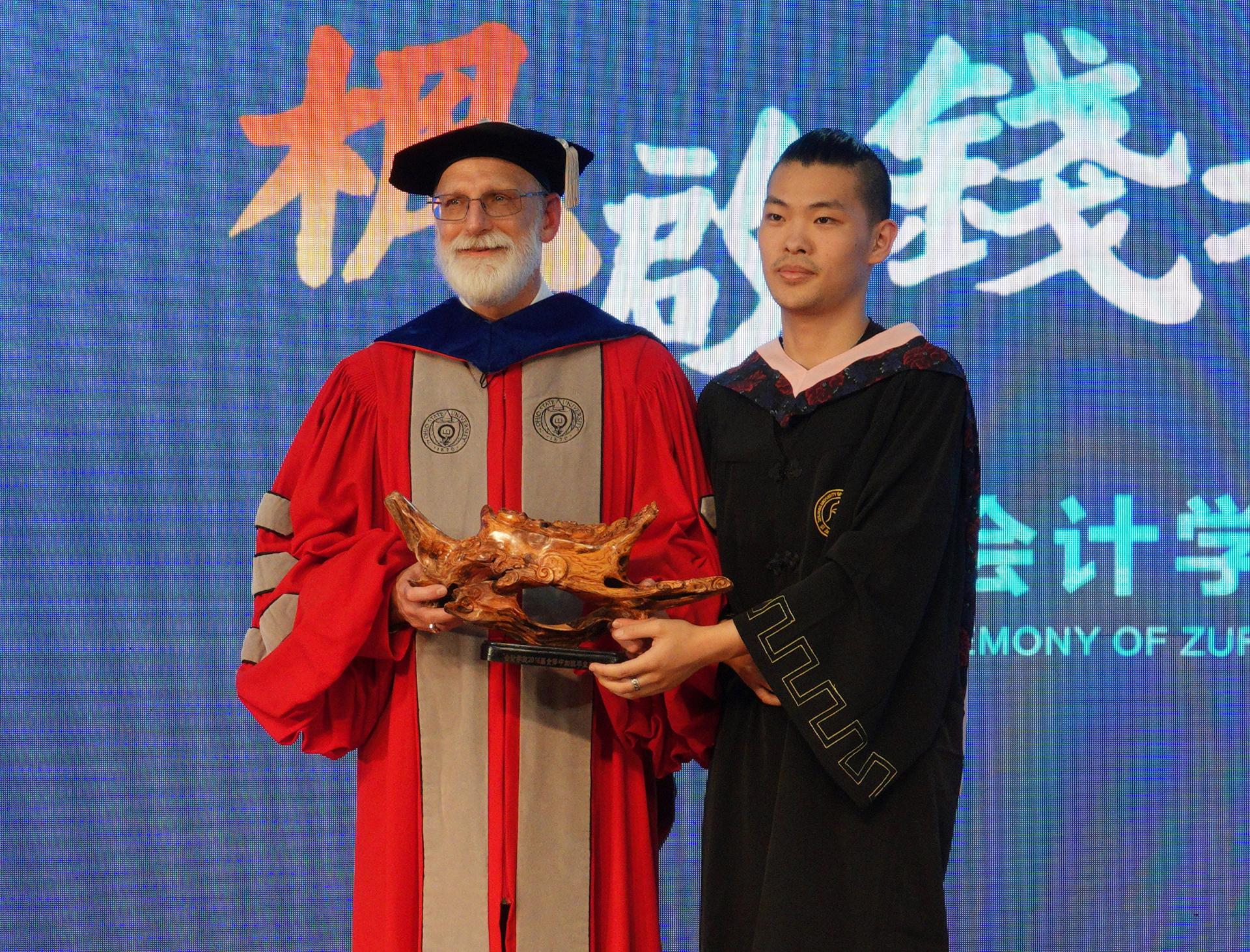 钟晓敏和李连华为毕业生授予中方学位证书,并为毕业生拨穂。Pierre Zundel和Stephen Havlovic为毕业生颁发了劳伦森大学工商管理学士学位证书。