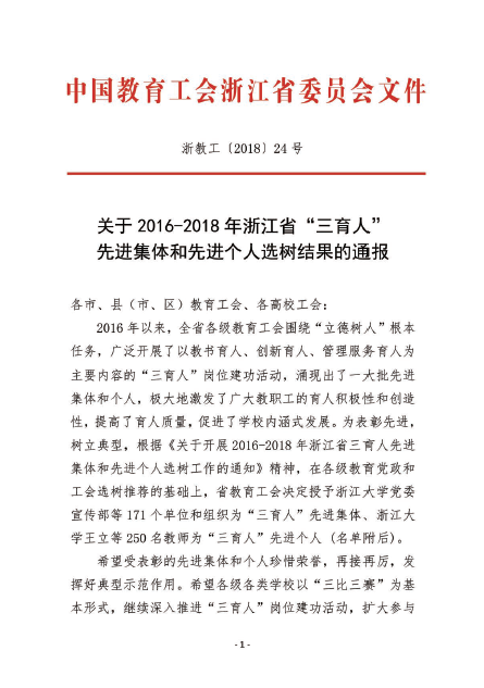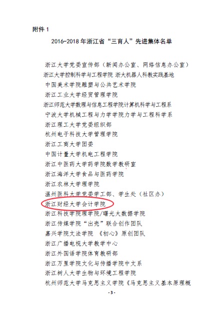 近日,浙江省教育工会通报了2016-2018年浙江省“三育人”先进集体和先进个人选树结果,会计学院榜上有名,被授予浙江省“三育人”先进集体荣誉称号。