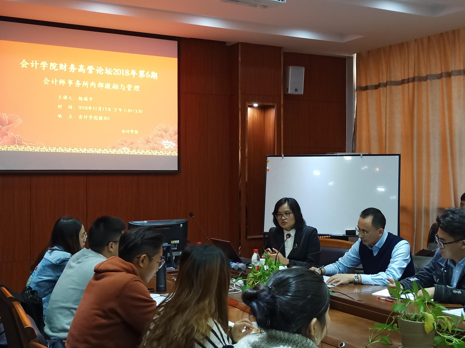 11月13日下午1:30,会计学院“财务高管论坛”2018年第6期在学院楼301报告厅举行。中汇会计师事务所高级合伙人杨端平老师受邀来我院做了主题为“会计师事务所内部激励与管理”的精彩讲座。本次讲座由邓川老师主持,2018级会计硕士和部分会计学硕、本科生参加了本次讲座。