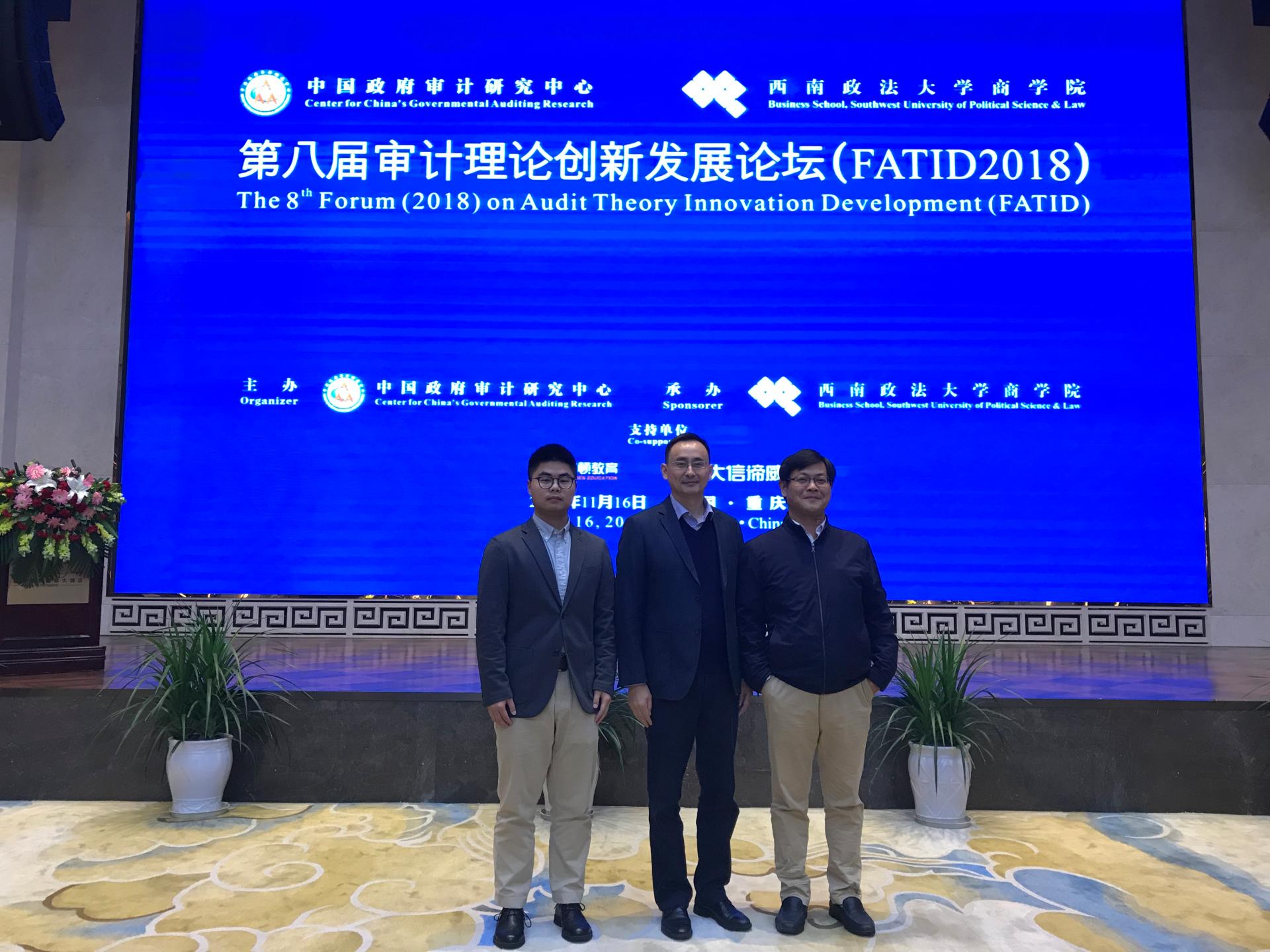 2018年11月15日-16日,由中国政府审计研究中心主办、西南政法大学商学院承办的第八届审计理论创新发展论坛于重庆市举行,我院副院长邓川教授、审计系主任宋夏云教授和硕士研究生李盛应邀参加了此次论坛。