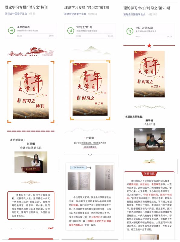 会计学院思政课堂引入了新的血液:“时习之”理论学习品牌。“时习之”三个字有其双重涵义,一是指时时学习习近平总书记的重要指示和讲话精神,将思政学习融入日常生活;二是出自《论语》的“学而时习之,不亦说乎”一句,引申为时常学习相关党团精神文件也是让人愉快振奋的。
