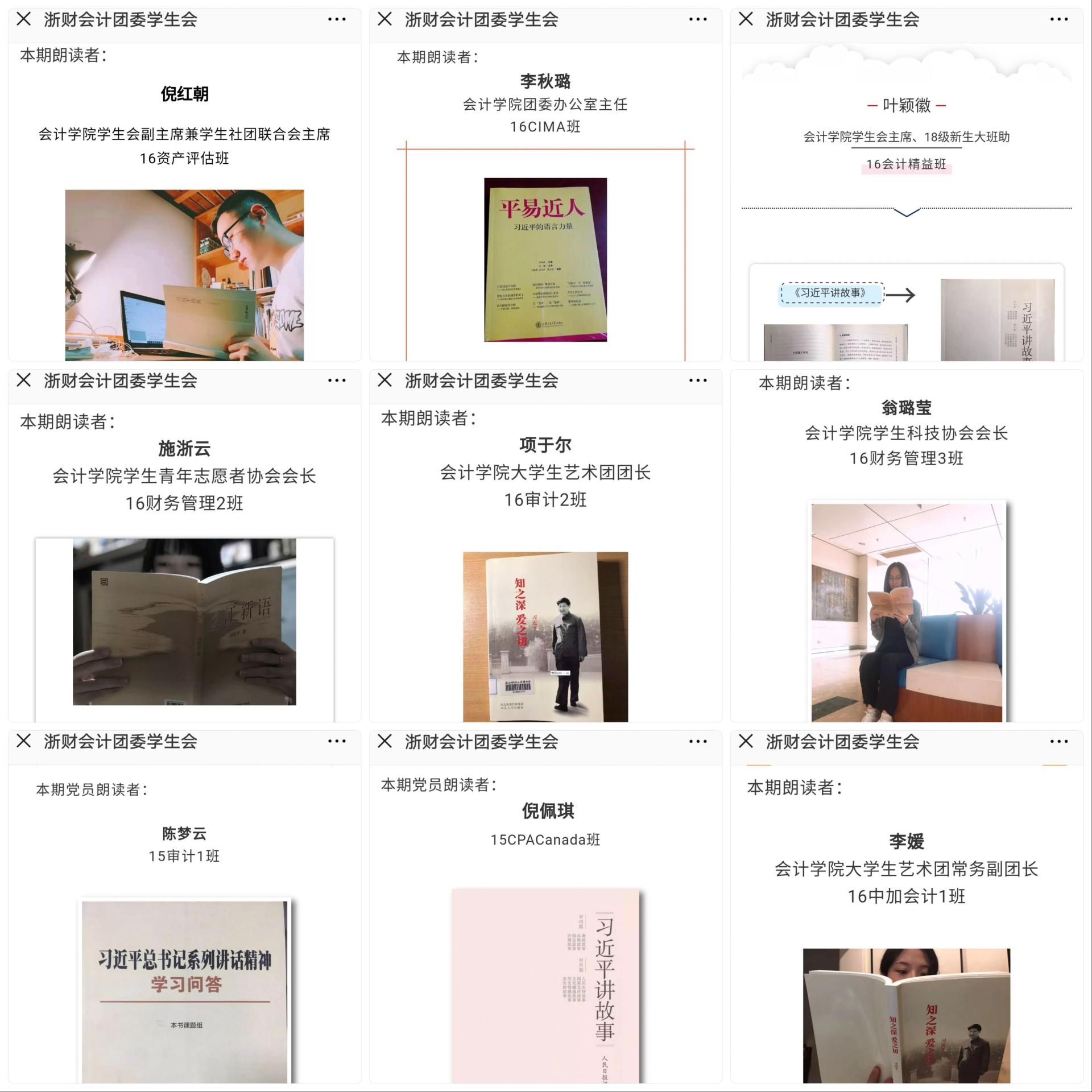 “时习之”线上活动以诵读习近平总书记重要论述为主,以微信推送为载体,并以“朗读者”的方式,引导学生时时学习党的最新理论成果,宣传党的十九大精神。在系列“时习之”学习中,会计学院教师党员、学生党员以及学生干部积极参与此项活动,阅读习近平总书记相关著作数十本,分享习近平总书记相关论述与自己心得体会40余万字,微信推送转发次数超1千,总阅读数近8000次。