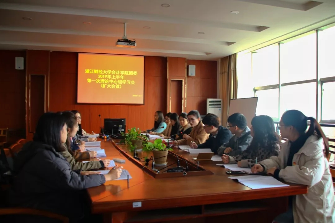3月7日下午,ued体育 会计学院团委2019年上半年第一次理论中心组学习会在学院楼301会议室召开。学院团委书记朱丽娟、各部门指导老师及主要学生干部参会。