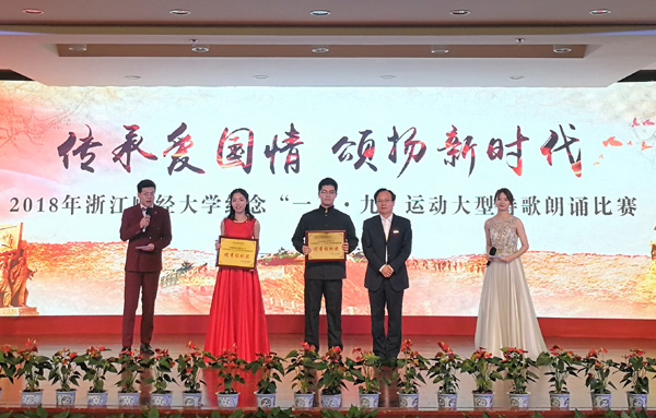 黄建新在致辞中指出,在改革开放40周年之际,学校举办纪念“一二·九”运动大型诗歌朗诵比赛更具有特殊的意义。广大浙财学子要在习近平新时代中国特色社会主义思想的指引下,铭记这段历史,珍惜改革成果,努力践行“爱国、励志、求真、力行”的要求,争做德智体美劳全面发展的社会主义建设者和接班人,在祖国的万里长空放飞青春梦想,谱写无愧于时代的青春赞歌。