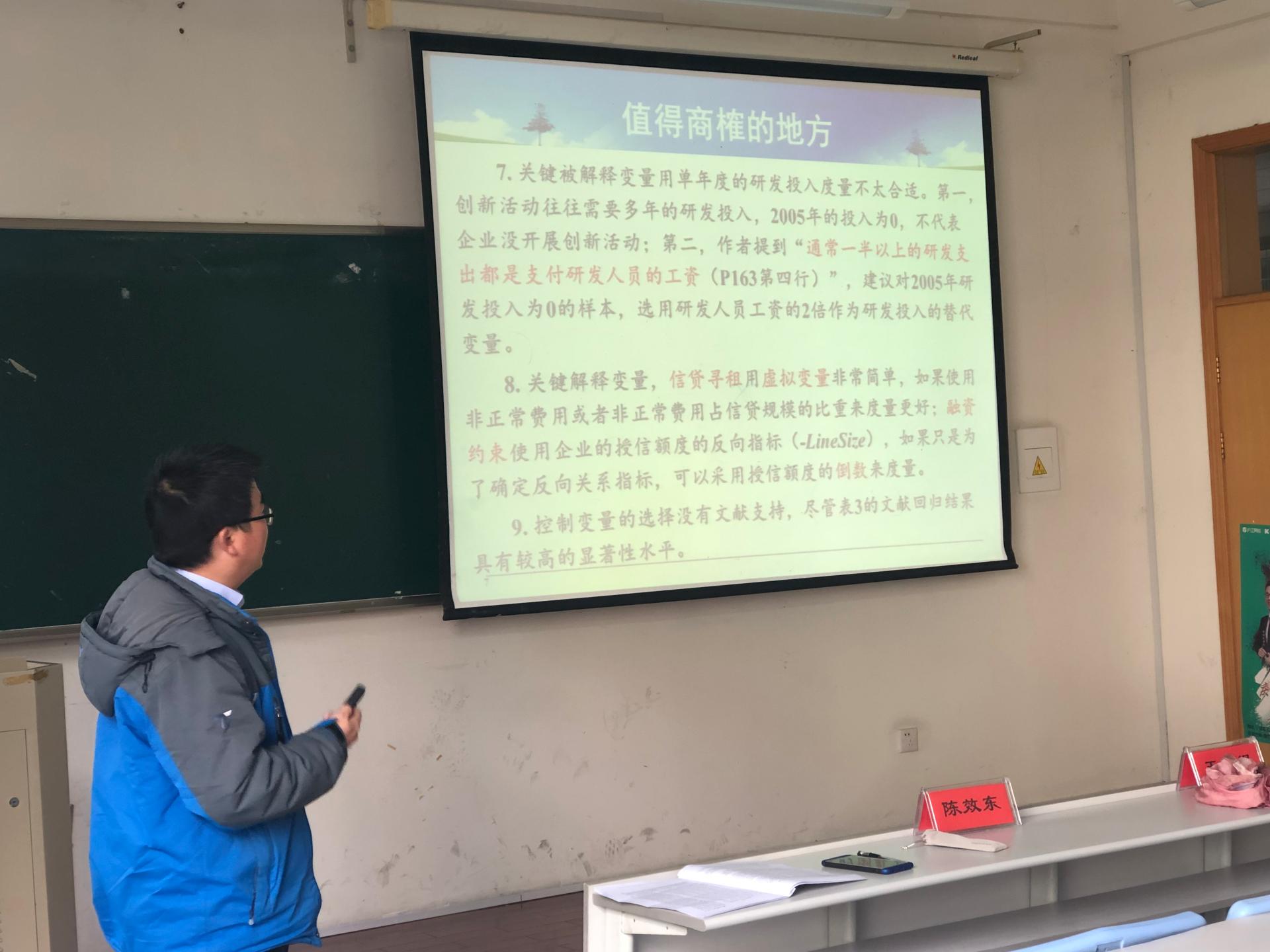 为促进研究生自主开展学术交流活动,提高研究生科研创新能力,“会计学院研究生双周学术沙龙”第7期于2019年3月7日下午在学院楼206举行。本次学术沙龙主讲人为17级会计学硕班的徐倩颖和谢文元同学。会计学院陈效东博士、王会娟博士、17级和18级全体会计学硕研究生参加了本次学术沙龙。