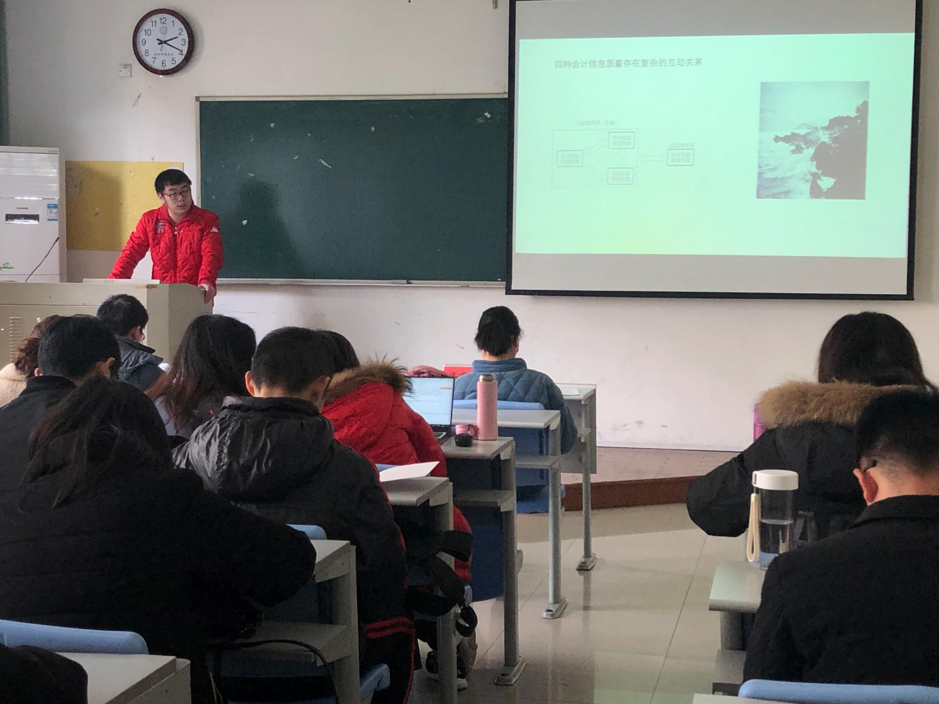 谢文元同学讲解的论文题目为《会计信息形式质量研究——基于通信视角的解构》。文章借鉴了通信模型,重构了“企业生成会计信息—编报会计信息—披露会计信息—信息使用者解读会计信息”的过程,将会计信息质量解构为会计信息内容质量、会计信息形式质量、会计信息传输质量和会计信息解读质量四大维度。