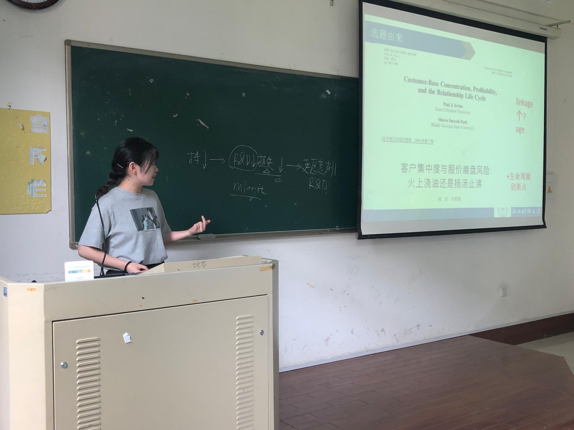 陆瑶同学讲解的论文是她目前正在进行的研究,题目为《企业生命周期、客户集中度与股价崩盘风险》。客户作为企业的重要利益相关者,会影响企业的经营决策、财务决策以及风险。鉴于此,本文将研究客户集中度对股价崩盘风险的影响;并进一步探究企业在不同生命周期,客户集中度是否会对股价崩盘风险造成不一样的影响。目前文章已经初具雏形,作者陆瑶同学想借此机会向老师们请教,希望老师们可以对她论文的理论逻辑提出修改建议,并让论文内容更加丰富。
