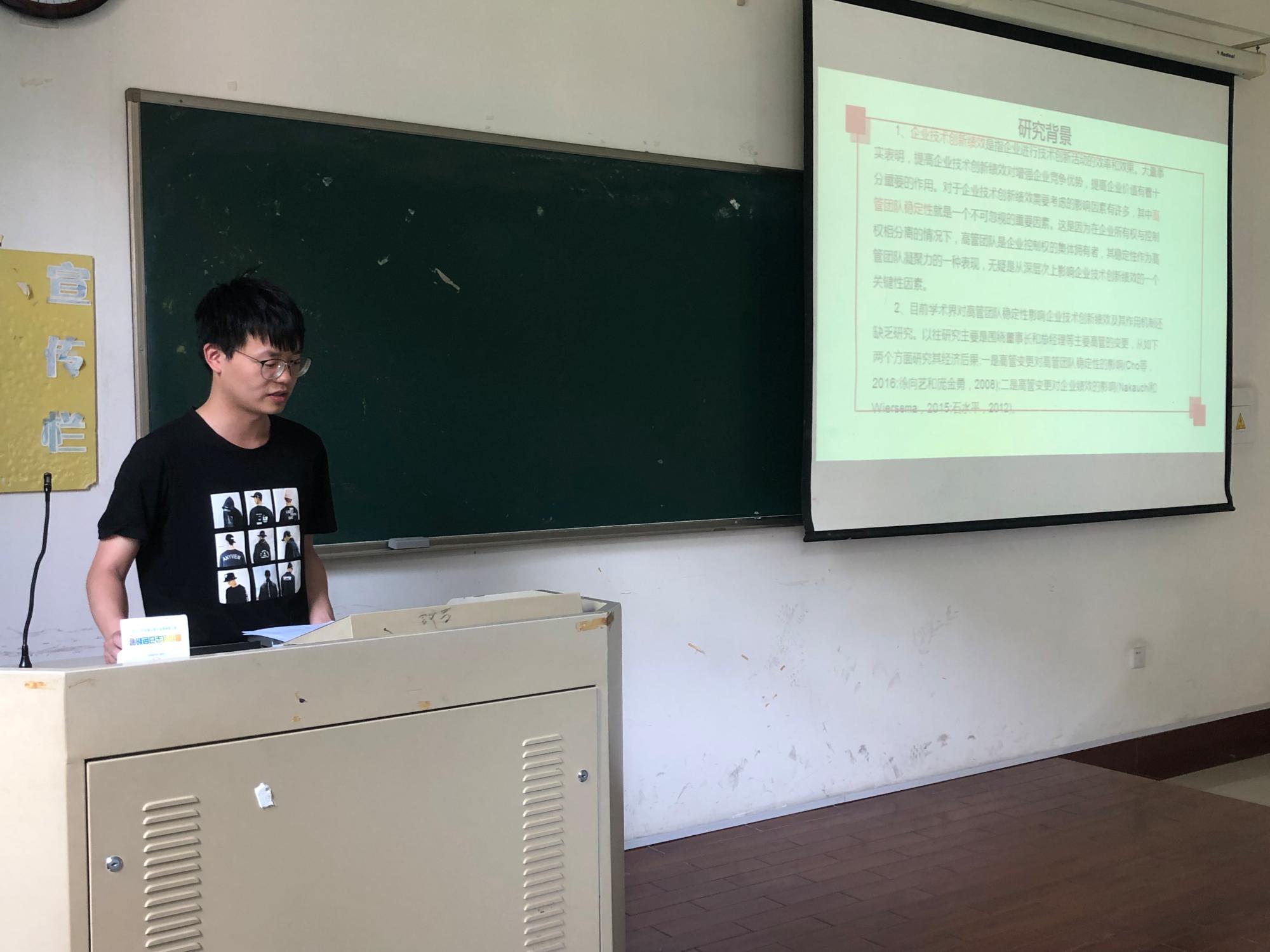 葛鹏辉同学讲解的论文题目为《高管团队稳定性会影响企业技术创新绩效吗——基于薪酬激励和社会关系的调节作用研究》。讲解从文章研究背景、研究假设、研究设计、实证结果、文章贡献、文章局限六个方面展开。企业技术创新绩效是指企业进行技术创新活动的效率和效果。大量事实表明,提高企业技术创新绩效对增强企业竞争优势,提高企业价值有着十分重要的作用。本文研究高管团队稳定性对企业技术创新绩效的影响,从而拓展了高管团队之经济后果的研究,为研究高管团队的作用机理问题提供了新的视角和思路。