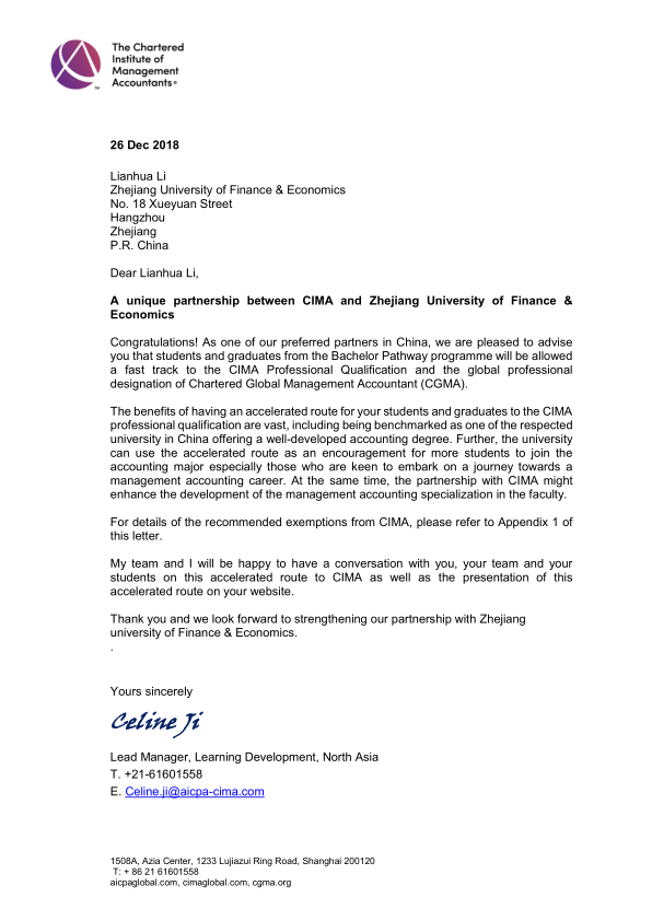 来信中写道:祝贺!作为我们在中国的首选合作伙伴之一,贵校CIMA方向班的学生将被允许快速获得CIMA职业资格和特许全球管理会计师(CGMA)的头衔……。