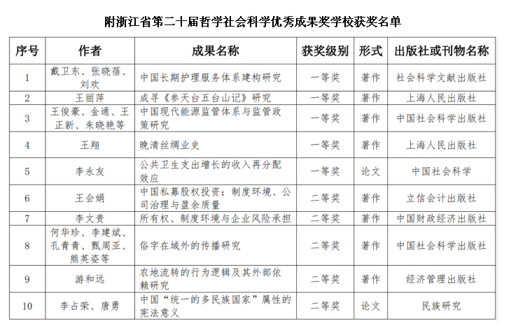 近日,浙江省第二十届哲学社会科学优秀成果奖评选结果揭晓,我校共有20项成果获奖,其中一等奖5项、二等奖6项、三等奖9项。我院李文贵、王会娟凭借各自独著的著作,斩获2个二等奖。