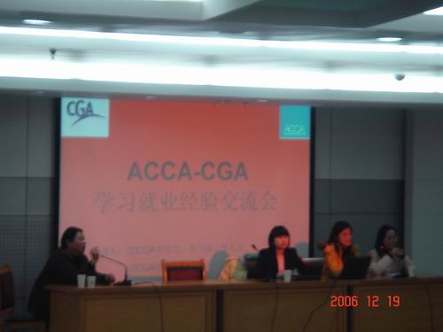2006年12月19日下午,会计学院在学术中心第四报告厅举行了“ACCA&CGA学习就业经验交流会”,会计学院院长汪祥耀教授、副院长邱学文教授、ACCA&CGA办公室王筱民博士、葛晓蕊老师、李晓峰老师及ACCA、CGA班的任课教师参加了交流会。02CGA班的三位优秀毕业生高潜(毕马威工作人员)、蔡海静(加拿大布洛克大学研究生)和赵婧(浙江财经学院会计学研究生)分别作了精彩报告并回答了同学们的提问。