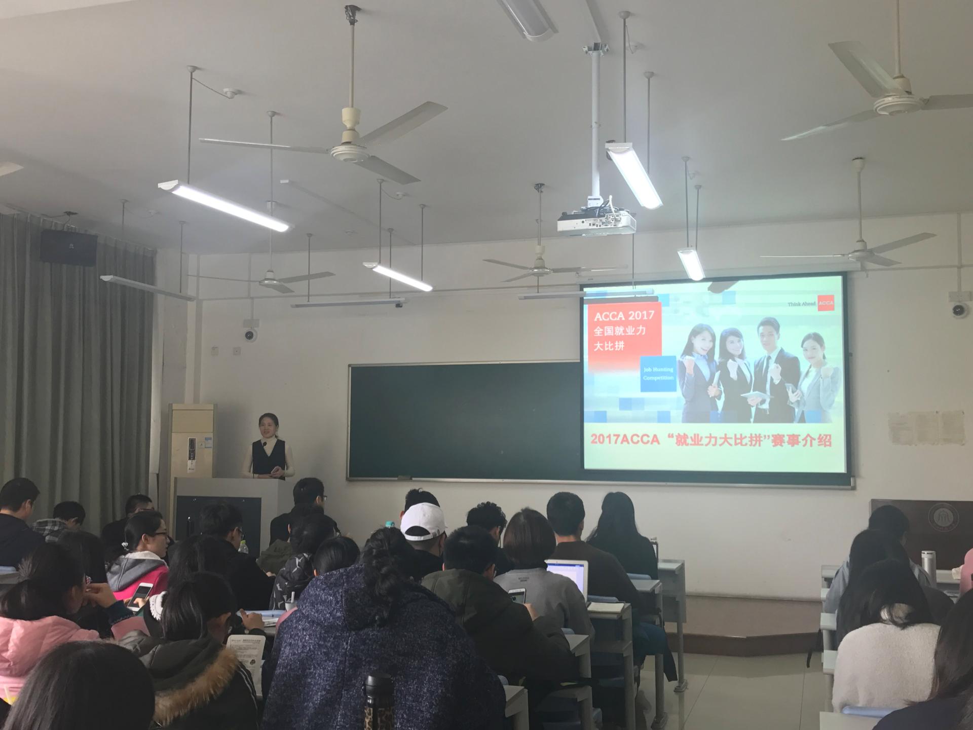 2017年3月21日下午, ACCA上海代表处在会计学院举办了ACCA就业力大比拼宣讲会。参加宣讲会的还有ACCA认可雇主上海上美化妆品有限公司和凯正财务管理咨询公司。