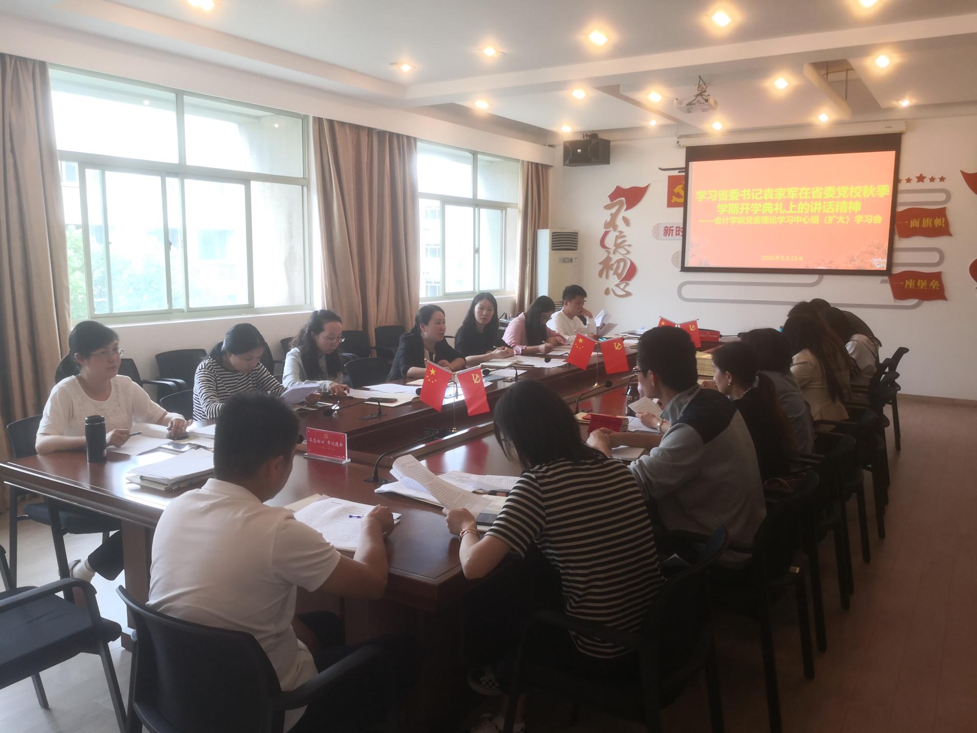 923日下午,会计学院在学院楼408党员之家召开党委理论学习中心组(扩大)会,专题学习省委书记袁家军在省委党校2020年秋季学期开学典礼上的讲话精神。学院党委理论学习中心组成员、各党支部书记参加学习。会议由学院党委书记张虹主持。