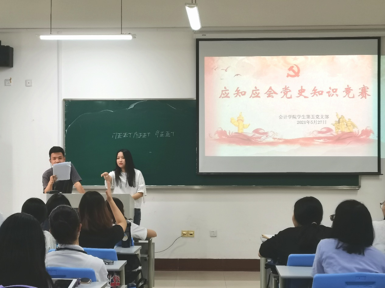 会计学院学生第五党支部于2021年5月27日下午在学院楼306举行了支部大会暨应知应会党史知识竞赛。本次会议由支部书记郑秋伟主持,支部全体党员参与。