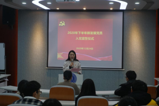 12月24日下午,会计学院在学院楼111报告厅举行2020年下半年新发展党员入党宣誓仪式。学院党委书记张虹、党委副书记陈炜出席仪式,组织员和2020年下半年新发展党员参加活动。活动由学院党委副书记陈炜主持。