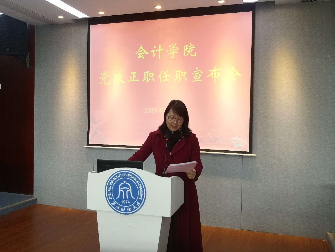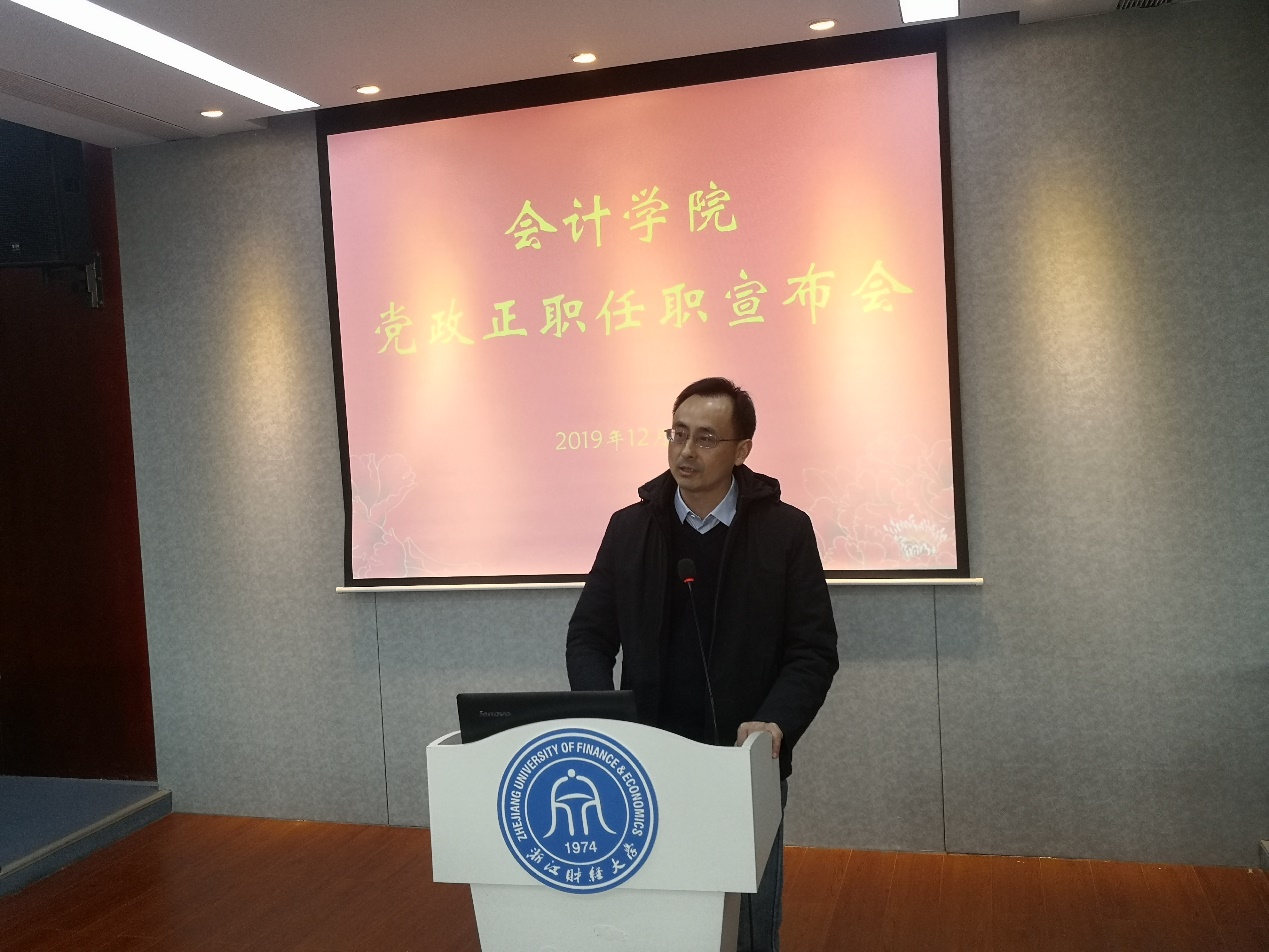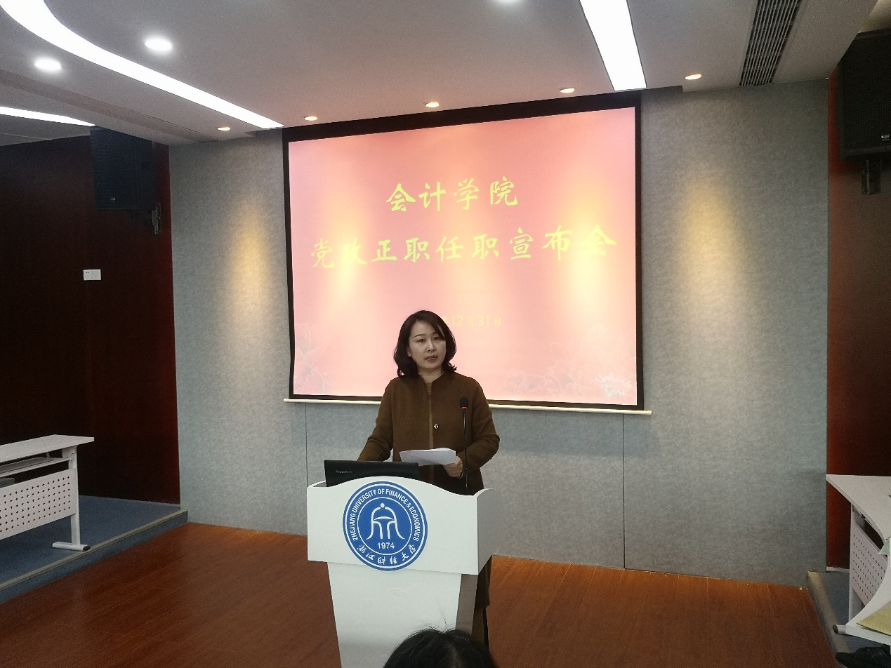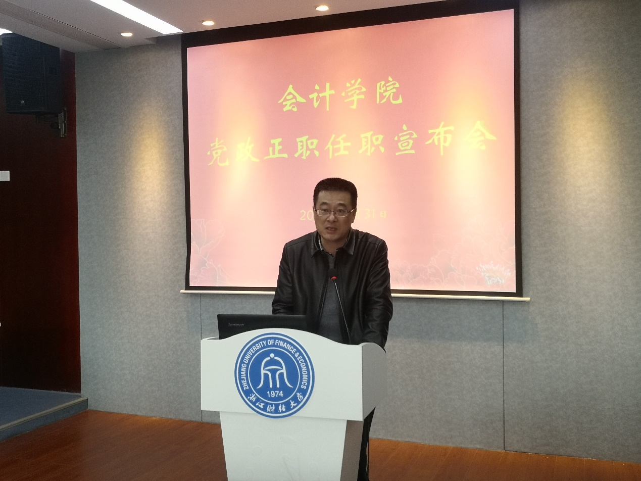 校党委委员、组织部部长徐晓东代表学校党政宣布任命决定,任命邓川同志为会计学院院长,张虹同志为会计学院党委书记。徐晓东介绍了邓川、张虹两位同志的情况,对他们的任职表示祝贺,并希望他们紧紧依靠广大师生,锐意进取、改革创新,切实肩负起领导学院改革发展、创新发展、转型发展的重任,推动学院各项事业再上新台阶,不辜负学校党委和学院全体师生的信任和重托。同时,徐晓东部长代表学校党政对学院发展和班子建设提三点希望:一是提高政治站位,坚持立德树人,努力培养社会主义建设的合格接班人;二是强化特色建设,进一步提升学院学科专业影响力,实现学院事业新发展;三是探索党建机制,进一步强化党在学院的领导核心地位,开创工作新局面。