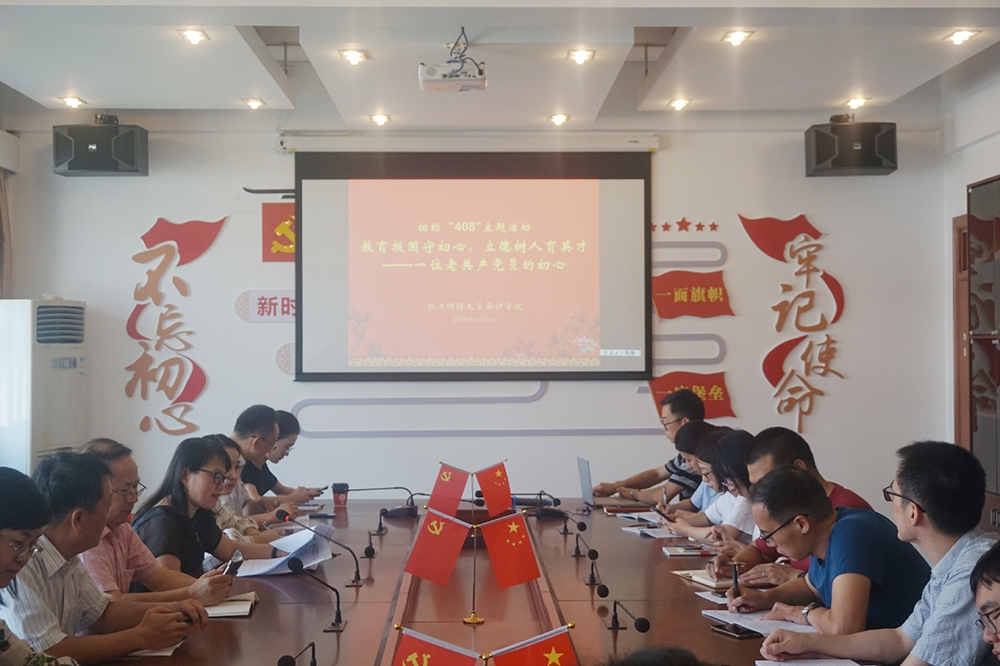 9月25日,“相约408”主题活动首次开展,会计学院党委与师生相约学院楼408党员之家,聚焦热点话题,共同开展“相约408”主题活动:教育报国守初心,立德树人育英才——一位老共产党员的初心暨院党委理论中心组学习(扩大)会。学院领导班子和各党支部书记参加主题学习活动。浙江省优秀共产党员、学院教师杨忠智进行分享交流。活动由学院党委书记张红英主持。