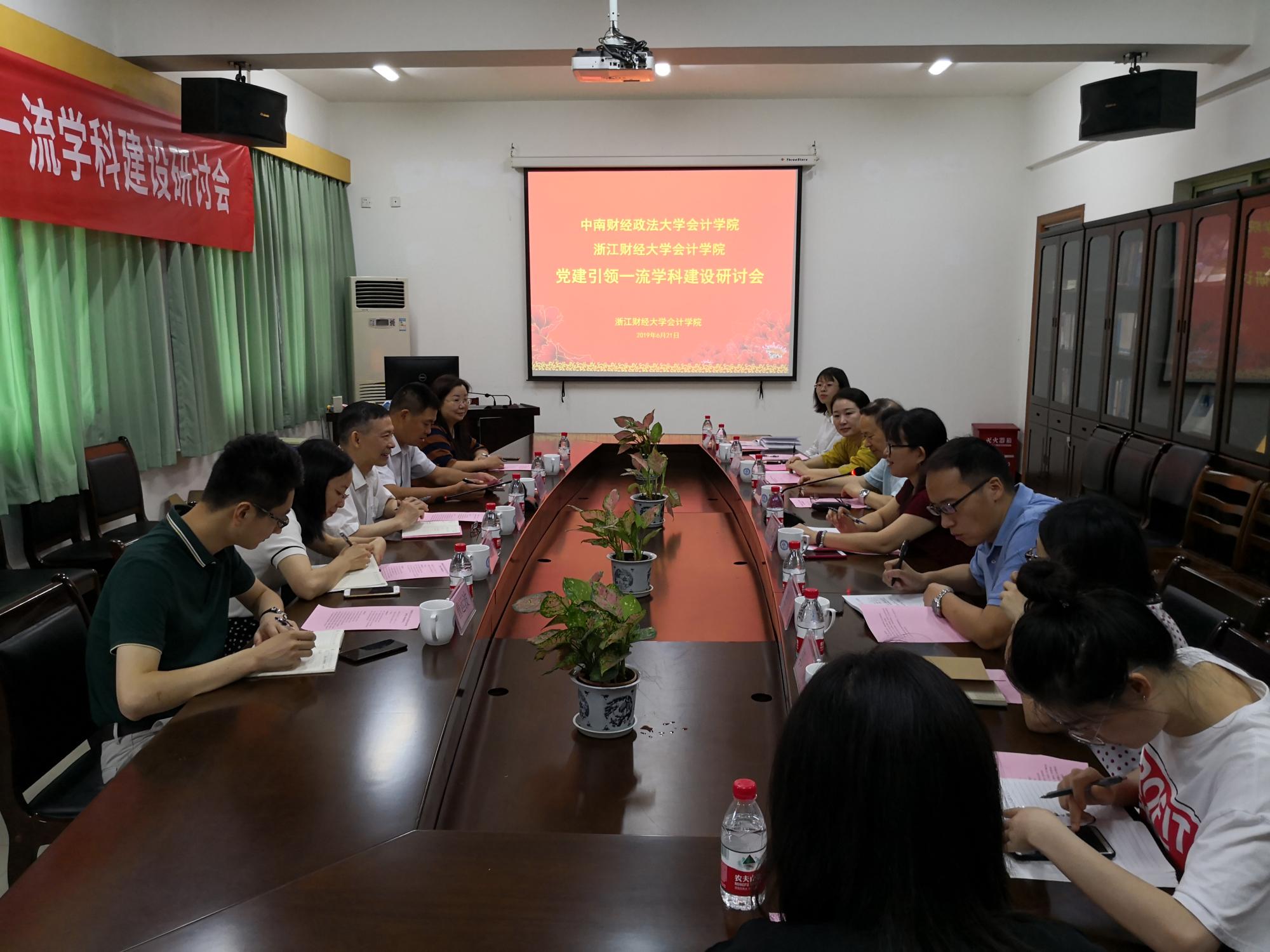 2019年6月21日,我院与同时入选教育部首批全国党建工作标杆院系的中南财经政法大学会计学院在学院楼406会议室开展“党建引领一流学科建设研讨会”。中南财经政法大学会计学院党委书记、副院长肖翠祥,院长、党委副书记张敦力,党务与学工队伍代表王芹、范纯琍、曹运波等莅临会议;我院党委书记、副院长张红英,院长、党委副书记李连华,党委副书记、纪委书记张虹,党务与学工队伍代表等参加会议。张红英书记主持会议。