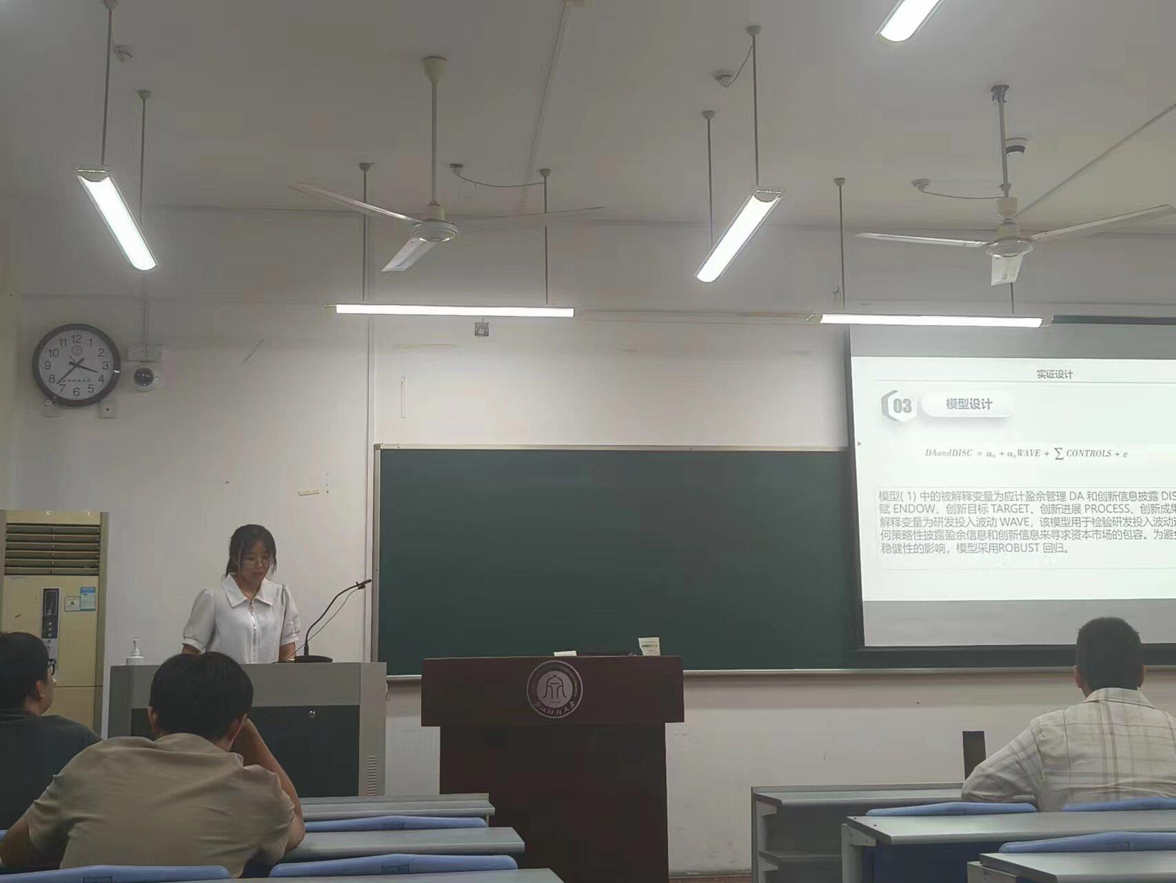 然后,刘铭同学分享论文《股票市场开放的未预期效应:来自MD&A纵向文本相似度的证据》。该文章研究发现股票市场开放显著提高了MD&A纵向文本相似度,这是因为公司的经营环境发生了变化,为了应对经营环境改变所带来的不确定性和风险,管理层会采取策略性披露行为,选择性地降低非财务信息的披露水平。对于QFII持股较少、内控质量较差以及分析师关注度较少的公司,股票市场开放对于MD&A纵向文本相似度的提高效应更为明显。管理层披露的样板化会导致未来股价崩盘风险的提升,给企业的经营和股票市场的稳定性造成负面影响。