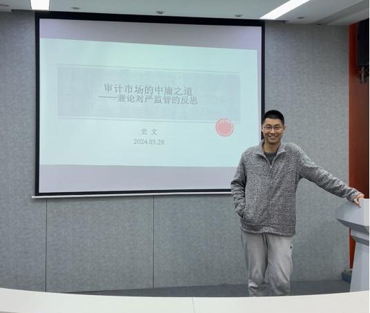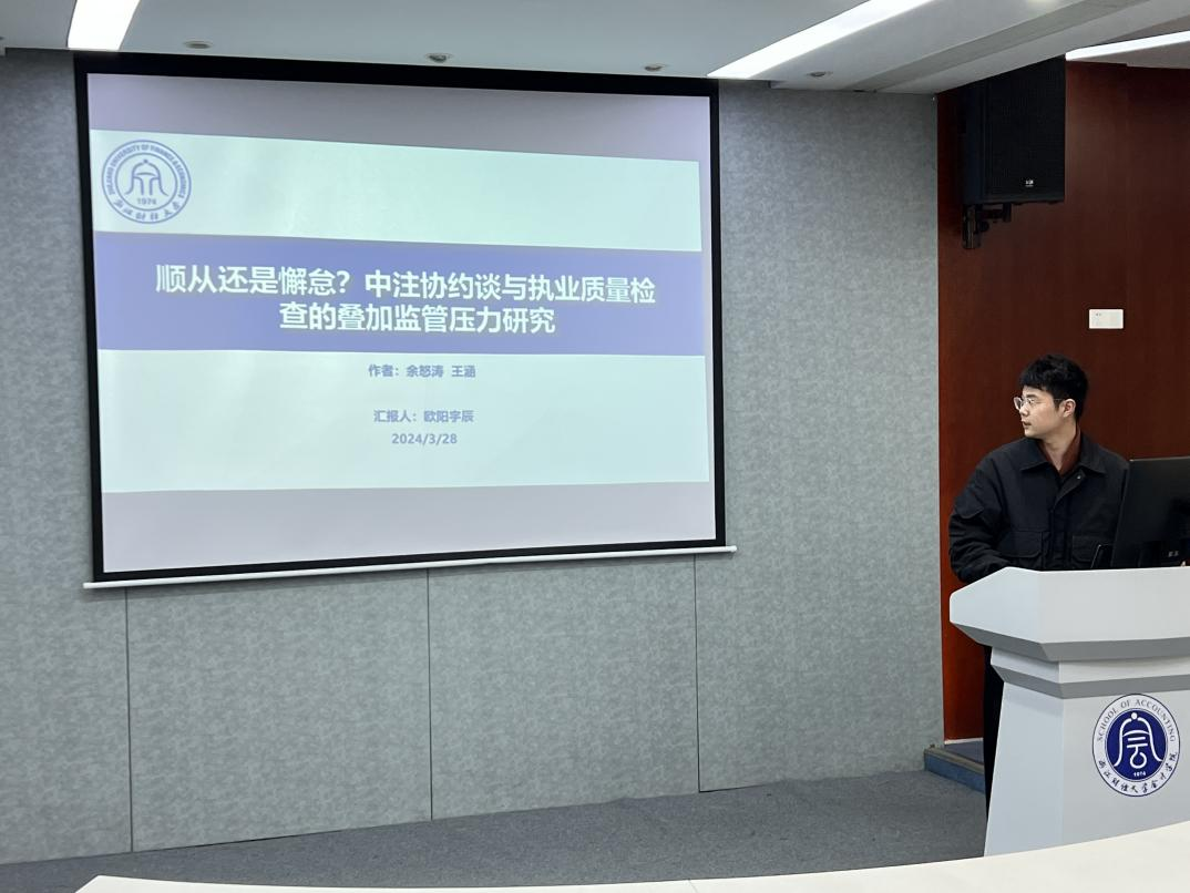 最后,欧阳宇辰同学分享论文《顺从还是懈怠?中注协约谈与执业质量检查的叠加监管压力研究》。该文研究发现,在中注协约谈与执业质量检查的叠加监管压力下,审计师显著提升了审计质量。进一步研究发现,行业叠加监管压力对审计质量的提升作用只在当面约谈、签字注册会计师同性别、签字注册会计师平均执业年限较长、签字注册会计师年平均客户数量较少时才明显;行业叠加监管压力与法律监管压力之间存在着替代作用;在面对行业叠加监管压力时,审计师也收取了一定的溢价。