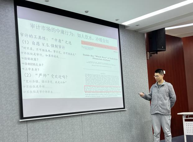 为促进研究生自主开展学术交流活动,提高研究生科研创新能力,锻炼研究锐度,“会计学院学术前沿”总第69期于2024年3月28日下午在学院楼111报告厅举行。本次学术前沿,由史文博士进行主题演讲,22级研究生赵柳锐、欧阳宇辰两位同学进行了论文分享,会计学院22级和23级部分会计学硕研究生、浙研院部分研究生以及部分本科生参加本次学术前沿活动。