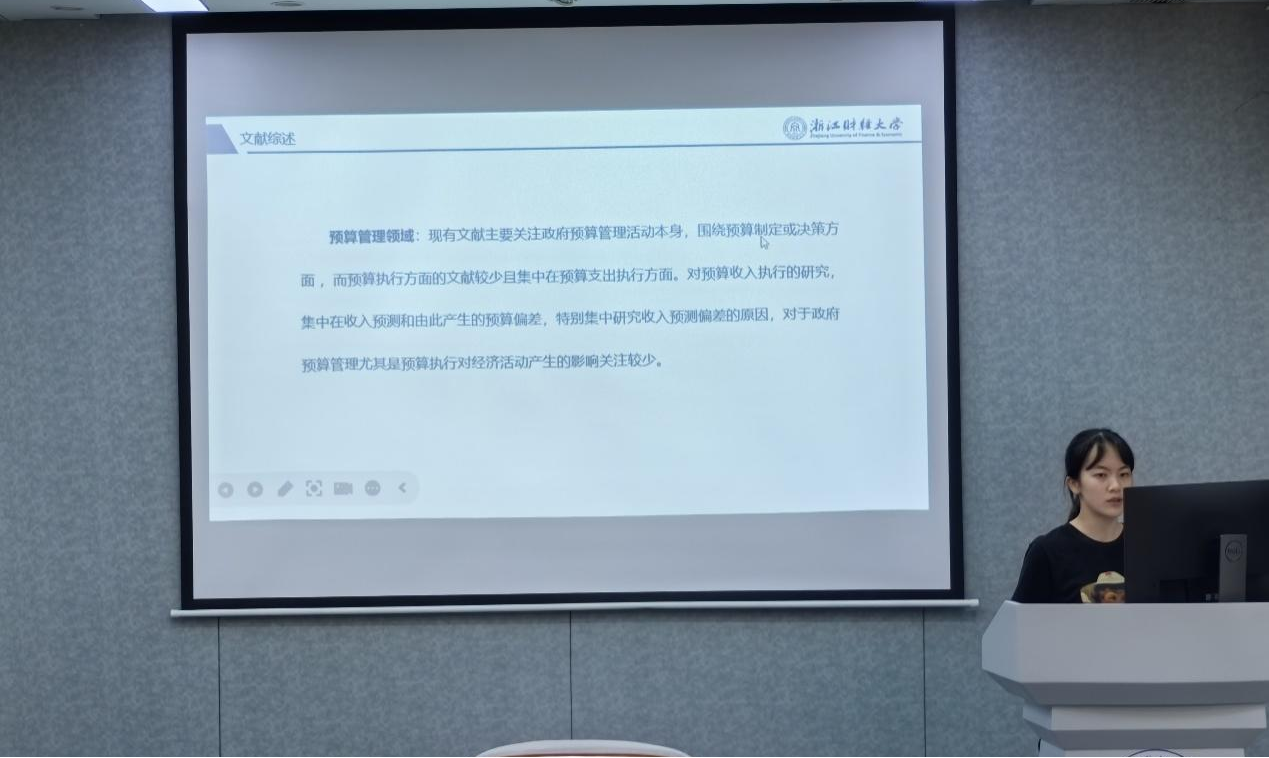 最后,沈品吟同学进行文献研读,文章题目为《政府预算管理、征税行为与企业经营效率》。税收效率原则要求政府征税行为有利于资源配置和经济运行,中国财政预算管理以年度预算为主,它在保障每年政府支出计划实现的同时,也会由于围绕年度内各时期预算目标的预算执行,导致企业纳税波动并影响经营效率。沈品吟同学介绍研究结论:政府财政收入预算执行进度与企业纳税增长显著负相关,其结果是企业纳税在时序上的非平滑和在横向上的非中性;政府年内预算执行波动越剧烈,企业纳税越呈现非平滑现象,对企业的风险预期、经营活跃性和经营报酬率产生的不利影响越大。由此提出落实税收法定原则,建立跨年度预算平衡机制,加强中期财政规划管理,同时重视支出预算配套的政策建议。
