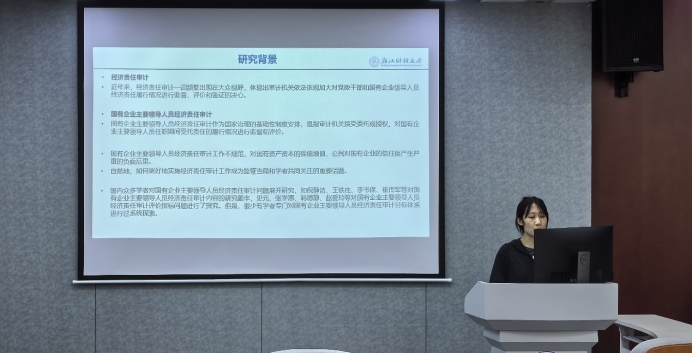 其次,尹明璇同学分享题为《国有企业主要领导人员经济责任审计目标体系研究》的论文。尹明璇基于文献梳理,分析提炼了国有企业主要领导人员经济责任审计的总目标。同时,在文献分析、法理分析、理论分析和实务考察的视角下,重点对国有企业主要领导人员经济责任审计具体目标要素进行研究。尹明璇认为,国有企业主要领导人员经济责任审计目标体系构成主要包括两个层次:一是总目标,在于独立、客观和公正地提供国有企业主要领导人员所负公共受托责任履行情况的鉴证信息,它是高度精炼,相对稳定的;二是具体目标,根据国有企业性质的不同侧重点不同,具体包括健全性、有效性、真实性或公允性、合规合法性、经济效益性、社会效益性、生态效益性和廉洁性,它是与时俱进,动态发展的。